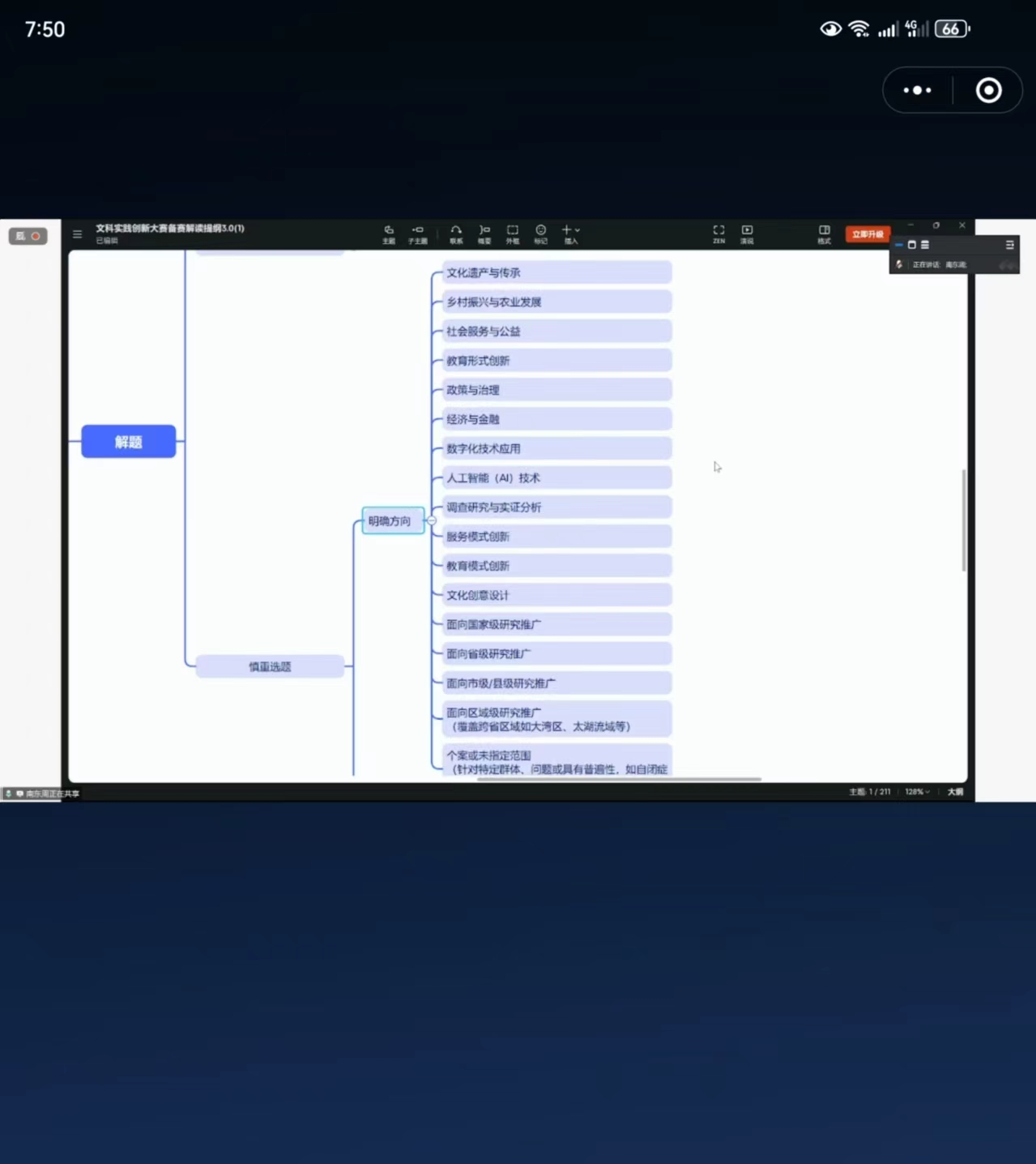 在内容设计上,讲座重点聚焦三大关键维度:一是项目论证的科学性与创新性,强调问题意识与解决方案的匹配度;二是实践过程的真实性与完整性,注重成果转化的社会价值;三是展示材料的逻辑性与感染力,提升项目的综合呈现效果。南东周老师还特别针对“理工医学科如何参与新文科竞赛”“如何体现真正的实践创新”等前沿问题,提供了独到见解和实用建议。