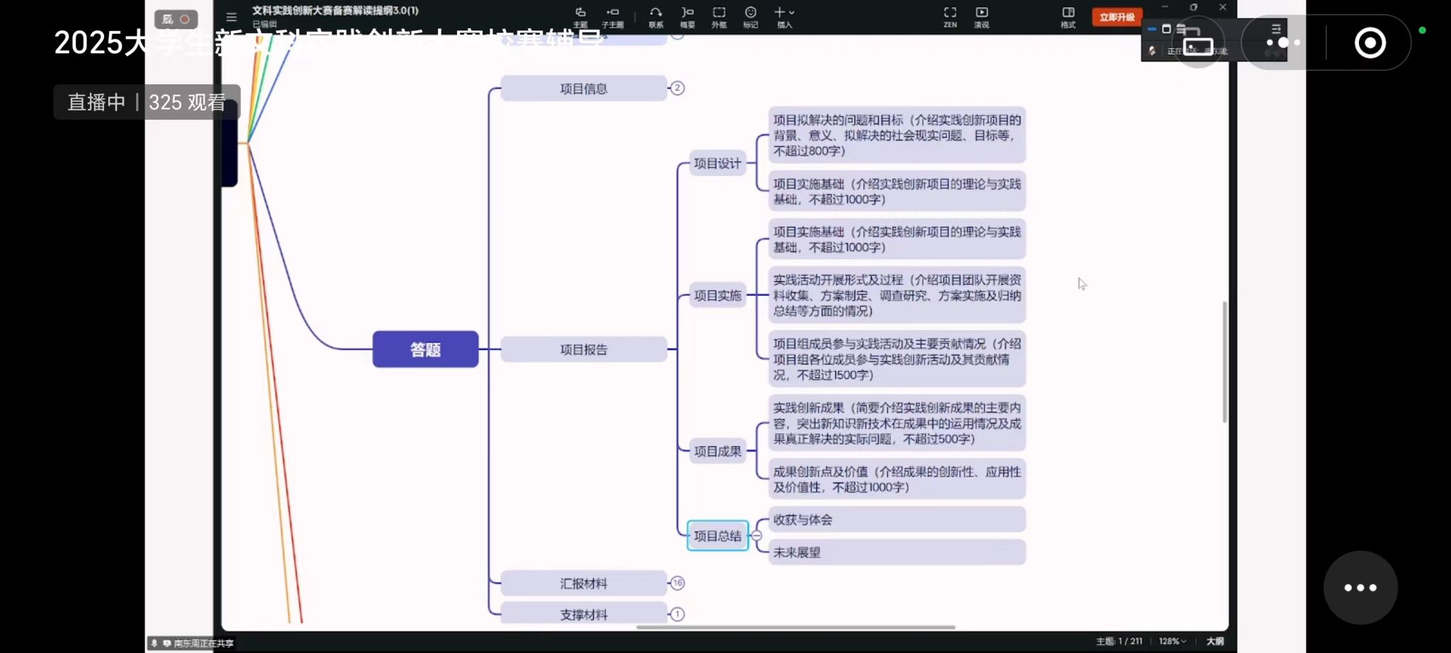 为深入贯彻国家新文科建设战略部署,推动学科交叉融合与创新人才培养,提升我校学生的实践创新能力,帮助参赛团队更好地备战校赛与国赛,9月28日晚,学生素质教育学院(创新创业教育学院)举办了2025年大学生新文科实践创新大赛校赛专题辅导讲座。本次讲座通过线上直播方式进行,吸引了全校52支参赛团队及众多感兴趣师生近400人在线观看。讲座特邀大赛主办单位山东大学创新创业实践育人工作负责人,新文科实践创新大赛主要策划人南东周老师担任主讲。