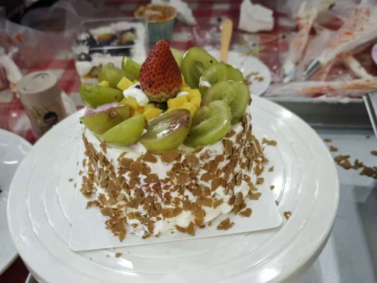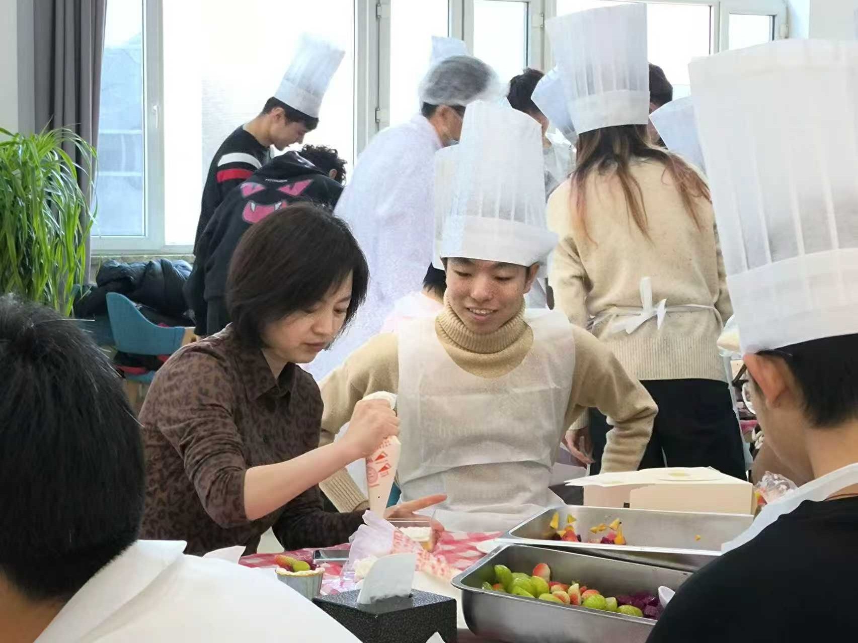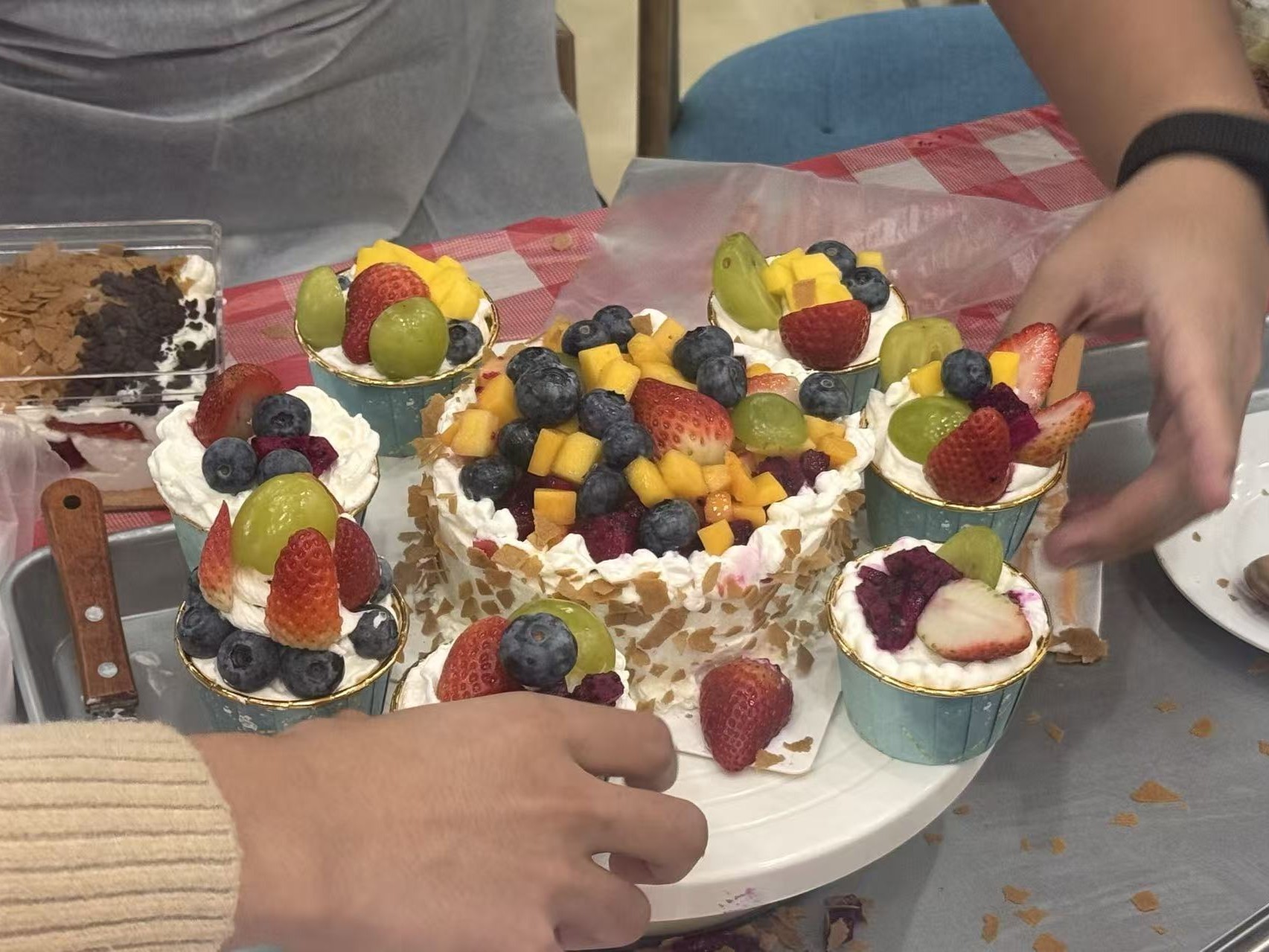 在专业甜品师的系统指导下,同学们迅速投入学习状态,有序开展纸杯蛋糕、水果盒子蛋糕及四寸生日蛋糕的制作。从奶油的精准打发到裱花的手法练习,从水果的色彩搭配到整体造型的创意设计,每一个环节都凝聚着大家的专注与耐心,课堂上既有实践操作的严谨,也有互助协作的温情。