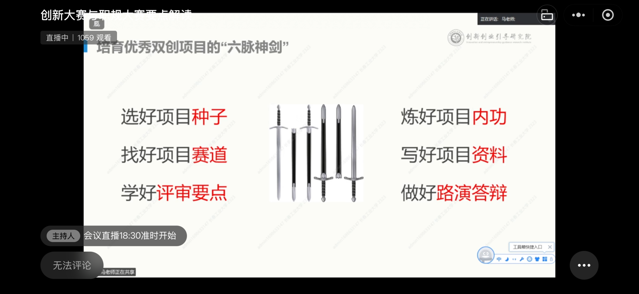 为深入贯彻落实国家关于深化创新创业教育改革、加强学生职业规划教育的决策部署,精准把握中国国际大学生创新大赛(2025)及第三届全国大学生职业规划大赛的新要求、新动向,全面提升我校师生参赛备赛的核心竞争力,2025年12月4日晚,学生素质教育学院(创新创业教育学院)成功举办了“以赛促教,就创融合——创新大赛与职规大赛要点解读”专题辅导讲座。讲座通过线上直播方式进行,吸引了全校各教学单位师生1100余人在线观看学习。