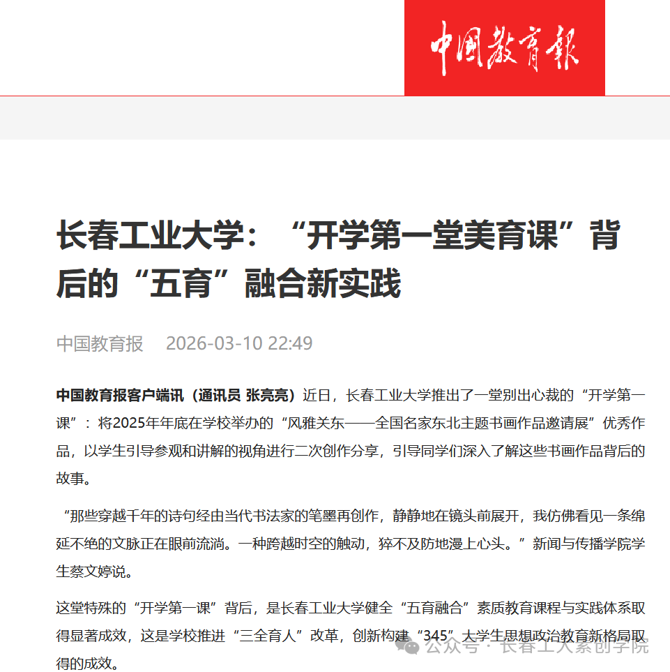 近日,由学院精心策划实施的“风雅关东·美在工大”美育视频获得国家级教育主流媒体《中国教育报》重点关注。该报以《长春工业大学:“开学第一堂美育课”背后的“五育”融合新实践》为题,对我校依托“风雅关东——全国名家东北主题书画作品邀请展”开展的创新育人模式进行了专题报道。