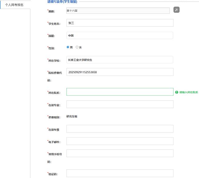 2.院校参赛代码(各校代码唯一,共18位):202509291152553658,该代码为学生个人报名时验证身份及查询报名人数时使用,请通知参赛学生牢记。